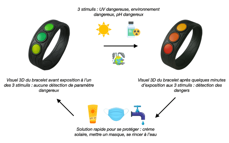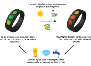 -Grâce au capteur UV : Avertir le porteur avec des paliers de dangerosité colorés lorsqu’il est nécessaire de mettre de la crème solaire pour sa sécurité.